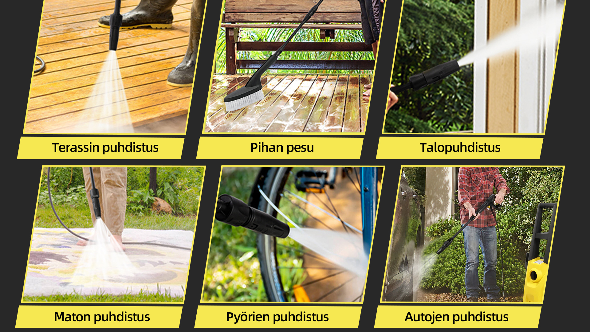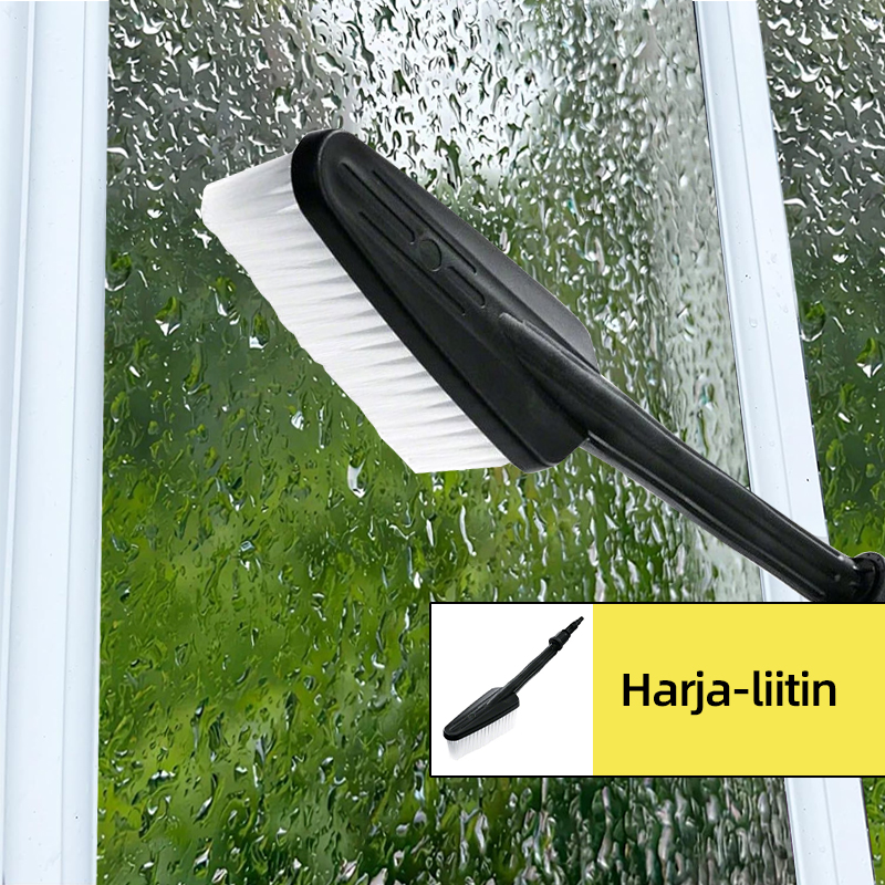 Erityisen tehokkailla pehmeillä harjaksilla varustettu harja parantaa painepesurin puhdistustehoa. Se on täydellinen käytettäväksi monilla eri pinnoilla, kuten puutarhakalusteilla, laseilla, autoilla ja ajoneuvoilla. Se auttaa sinua puhdistamaan suuret ulkotilat ja renkaat nopeasti ja vaivattomasti.